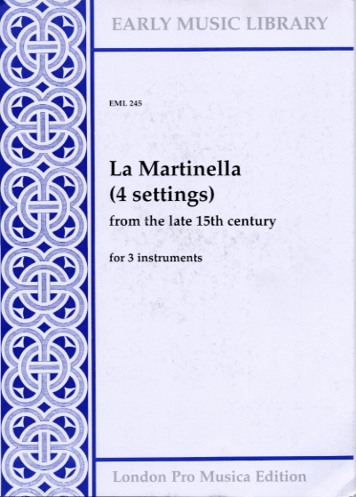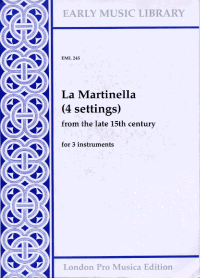 for 3 instruments.These four pieces come from MS Banco Rari 229 (formerly Magl. XIX 59) of the Biblioteca Nazionale Centrale in Florence, one of the most substantial collections of secular music from the end of the fifteenth century.The first piece here is, as it were, the “real La Martinella”; it was one of the more widespread pieces of its day, surviving in at least twelve other sources; one of these, the Segovia manuscript, has a virtuosic contratenor attributed to Heinrich Isaac (printed inside the cover of this edition). As the piece appears only under this title, it would seem to have been a real instrumental piece, as opposed to a rondeau without text; it could be said to belong to the same family as Josquin´s La Bernadina and Ghiselin´s La Alfonsina. The same can almost be certainly be said for the Isaac piece, which would in any case be a little long for a rondeau, given all the repeats that this form entails. La Martinella pittzulo is also probably an instrumental piece, but there is some doubt over the fourth piece, with appears in two sources with what seem like first words of chansons texts.Johannes Martini (c. 1440-1497) was, in spite of his name, a musician from Brabant; like many other musicians of his generation from the Low Cotintires, he moved to Italy, and in fact spent most of his working life at the ducal chapel in Ferrara, apart from a short spell in Milan.In this edition the original accidentals are taken as applying to the whole bar until contradicted, but purely editorial accidentals, printed small above the stave, apply to the individual note only. The original note values have been halved. This does give a very “white” note picture, but allows the cross-rhythms to come through. I would suggest an average tempo of semibreve (whole note) = 60-70 for these pieces.The pieces are printed here at their original pitch, which is fine for “soft” instruments such as recorders, viols and flutes. It is fairly clear, however, that players of wind instruments such as cornetts., shawms and sackbuts were used to transposing their music up a fourth or fifth. For the benefit of such instrumentalists we have produced a transposed set of scores (EML245a). This edition follows the Florence version throughout, with one exception: bars. 11-12 of the discantus of no. 4 appear after Rome, Biblioteca Casatense 2856, where the range of certain pieces have been reduced to fit wind instruments.