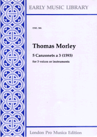 for 3 voices or instruments.These five pieces come from Thomas Morley´s Canzonets or Little Short Songs to three voyces, originally published in London in 1593, though no. 5, Love learns by laughing, was not included in the first edition. In fact all five pieces here are printed after the reprint of 1606, which is preferable in a number of minor respects.Morley´s pieces obviously take the canzonette of such north Italian musicians as Orazio Vecchi as their starting-point: the resemblance is particularly striking in Thirsis, let pity move thee, with its characteristic dotted rhythms. But there is perhaps more variety of mood and treatment in some of Morley´s pieces than would find in a typical canzonetta.See, mine own sweet jewel was included in Morley´s Consort Lessons of 1599 in a version for broken consort (violin, flute, viol, cittern, bandora and lute), called “Joyne hands”. This demonstrates, as if that were really necessary, how well such music transfers to instruments.In this edition the original note values have been retained; however in no. 3 the short triple section (bar 15) is written in black notes in the original (the first note is a black semibreve). The original time-signatures have been retained; bars have been added every two or three beats, to reflect the rhythm of the words, though I have not gone as far in this as did E. H. Fellowes in his complete edition (The English Madrigal). Editorial accidentals are shown in the usual way, printed small above the stave, applying to the one note only; for the sake of simplicity, the original accidentals, printed on the stave, are taken as applying to the whole bar.