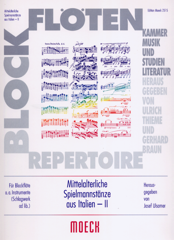 aus Italien für eine Blockflöte (div. Stimmlagen) und Schlagwerk ad lib., Heft II, hg. Ulsamer.Inhalt: Belicha; Parlamento; In pro; Principiu di Virtu; Saltarello; Lamento di Tristano; La Manfredina; Saltarello.