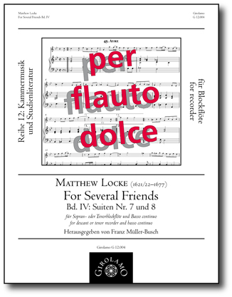 Suiten für Sopran- oder Tenorblockflöte und Bc. Bd. IV: Suiten 7 (c-moll/C-dur) und 8 (d-moll), hg. Müller-Busch, Partitur und Stimmen.Matthew Locke wurde 1621 oder 1622 mit großer Wahrscheinlichkeit in Devon geboren und starb 1677 in London. Zusammen mit William Byrd (1543–1623), William Lawes (1602–1645) und Henry Purcell (1659–1695) gehört er zu den bedeutendsten und profiliertesten Musikerpersönlichkeiten des Englischen Barock. Sein kompositorischer Schwerpunkt lag bei Bühnenwerken sowie bei instrumentaler Kammermusik. Während des Commonwealth bewegte sich Locke in adligen und bürgerlichen Kreisen. Mit der Restauration der englischen Krone im Jahre 1660 wurde Locke von Charles II. zum Hofkomponisten mit verschiedenen Aufgabenbereichen ernannt. Diesen Posten behielt er bis zu seinem Tode. Sein Amtsnachfolger war Henry Purcell.Unter der Signatur Add. MS 17801 wird in der British Library, London, ein Band aufbewahrt, der verschiedene Werke Matthew Lockes in seiner eigenen Handschrift enthält. Zu Beginn des Bandes findet sich auf 21 Seiten die mit Ffor Severall Ffriends überschriebene Sammlung von 54 durchnumerierten Suitensätzen. Diese Sätze sind nicht ausdrücklich zu Suiten zusammengefasst, jedoch legt die Sortierung nach Tonarten dieses nahe. Es ist aber sicher nicht verboten, sich seine eigenen Suiten aus den Sätzen zusammenzustellen.Beispielseite