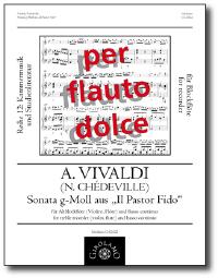 aus 'Il Pastor Fido' (RV 58) für Altblockflöte und Bc., hg. Müller-Busch, Part. und Stimmen.1737 erschien in Paris bei Me. Boivin eine Sammlung von 6 Sonaten mit dem Titel Il Pastor Fido, / Sonates, / pour / La Musette, Viele, Flûte, Hautbois, Violon, / Avec la Basse Continüe. / Del Sigr. / Antonio Vivaldi. / Opera XIIIa. / …Es ist inzwischen hinreichend bekannt, dass es sich bei Il Pastor Fido keineswegs um ein Werk Vivaldis handelt, sondern vielmehr um eine Fälschung unter Einbeziehung einiger Ausschnitte aus Werken von Joseph Meck, Giuseppe Matteo Alberti und Antonio Vivaldi. Dank der Forschungen von Philippe Lescat ist nun bewiesen, dass tatsächlich Nicolas Chédeville le cadet (der Jüngere, 1705–1782) der Komponist bzw. Arrangeur des Sonatenbandes ist und dieser im Rahmen eines Privilège du Roy (einer Druckgenehmigung des Königs) von seinem Vetter, dem Verleger Jean Noël Marchand auf Wunsch Chédevilles unter dem Namen Vivaldis veröffentlicht wurde.Chédeville war insbesondere als Spieler und Lehrer der Musette (ein kleinerer Dudelsack mit 2 Spiel- und 2 bis 4 Bordunpfeiffen) in Paris berühmt, wo er u.a. um 1748 den Töchtern Ludwig XV. und dem König selbst das Spiel auf diesem Instrument beibrachte. Er war zudem lange Jahre als Oboist Mitglied in Chambre und Ecurie du Roy und hatte einen Posten als Fagottist an der Pariser Oper. Er veröffentlichte eine größere Zahl von Werken für die Musette, darunter Bearbeitungen italienischer Kompositionen ebenso wie eigene Suiten und Sonaten im französischen bzw. italienischen Stil.Die hier veröffentlichte 6. Sonate des Druckes zeigt ausschließlich Merkmale der italienischen Kompositionsweise. Eine Übereinstimmung der ersten drei Sätze mit anderen Werken konnte bislang nicht festgestellt werden. Man kann daher davon auszugehen, dass sie vollständig von Chédeville stammen. Die prägnanten Themen und der gut gearbeitete Bass der beiden ersten Sätze sowie der thematische Bezug des zweiten Satzes zum vierten Satz zeigen, wie sehr sich Chédeville den italienischen Stil zu eigen gemacht hat. Die Musik des vierten Satzes (und dies sind immerhin ca. 30 % der Sonate) stammt bis auf zwei Kürzungen und wenige minimale Veränderungen von Vivaldi. Es handelt sich hier um den ersten Satz des Violinkonzertes op. 4/6 (RV 316a), das J. S. Bach für Cembalo solo bearbeitet hat (BWV 975).Beispielseite