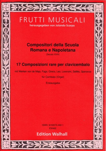 mit Werken von de Majo, Fago, Greco, Leo, Lorenzini, Sellitto und Speranza für Cembalo (Orgel), bearbeitet von Jolando Scarpa. Der Band enthält zahlreiche Erstausgaben mit Fugen, Toccaten und Präludien aus einem wichtigen Zentrum der Cembalo- und Orgelkunst, das im 17. Jahrhundert eng mit der römischen Orgelschule verbunden war.