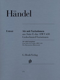 aus der Suite E-dur HWV 430 (Grobschmied-Variationen), Urtextausgabe, hg. Hicks.Händels Variationen, genannt 'Der harmonische Grobschmied' gehören zu seinen bekanntesten Klavierwerken. Zu dem eigentümlichen Thema soll Händel angeblich inspiriert worden sein, als er vor einem Regenguss in der Werkstatt eines Schmieds Zuflucht suchte, und diesen zum Klang seines Ambosses ein fröhliches Lied singen hörte. Händel verwendete das Thema mit fünf Variationen als Schlusssatz seiner fünften Klaviersuite, die er 1720 veröffentlichte. Mit ihrem eingängigen Thema erfreuten sich die Grobschmied-Variationen in der Folge immer größerer Beliebtheit, auch als eigenständiges Stück. Die hier vorliegende Ausgabe benutzt als Hauptquelle Händels Ausgabe der Suite, die er sicher selbst überprüft hat, und dazu die verfügbaren handschriftlichen Quellen.
