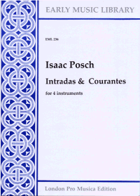 for 4 instruments.These intradas and courantes, in common with the five-part paduana and gagliarda already published in this series (EML 201) come from Posch´s Musicalische Tafelfreudt, das ist allerley neuer Paduanen und Gagliarden a 5, desgleichen Intraden und Couranten, published inNürnberg in 1621.The intradas in the collection are well-constructed miniatures, which develop short motives in a variety of quite satisfying ways. Some of them are quite elaborate, with divisions in the top part that can really only be played on the violin: for. this selection we have chosen pieces written in a more “neutral” instrumental style.The musical relationship between the intrada and the couranta varies from piece to piece. In no. V the opening of each section of the couranta is based on that of the first two sections of the intrada, and the same is true of no. Xl; in the other two pieces there is definitely a relationship, but it is less obvious. Intrada V is unusual in that the same opening idea is used in all three sections, but starting on different notes of the scale: this feature, combined with the use of similar figuration in the first and third sections, holds the piece together in an attractive way. Intrada IV also has an attractively coherent structure: it is largely based on a combination of a slow descending theme in minims and a faster one with syncopations. This kind of strongly focused structure is common in the best German intradas of the time, particular those of Widmann and Franck.In this edition the original note values have been retained in the duple-time pieces but halved in the courantes. Editorial accidentals are shown in the usual way. Where the bass part goes below F, alternatives are supplied in small notes.