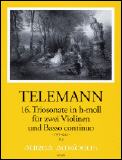 TWV 42:h5 für 2 Violinen und Bc., hg. Kohn, Partitur und Stimmen. Mit der vorliegenden 16. Sonate liegt 'fast' das gesamte erhaltene Triosonaten-Werk Telemanns in Einzelausgaben vor. Die gewählte Numerierung erspart zur raschen Erfassung den Umweg über das Werkverzeichnis.