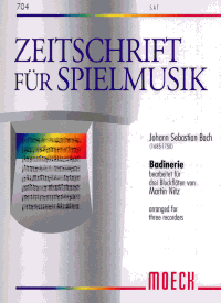 bearbeitet für drei Blockflöten (SAT) von Martin Nitz, Partitur und Stimmen.Inhalt: Badinerie aus dem letzten Satz der Suite in h-moll für Traversflöte und Orchester (BWV 1067). Schwierigkeitsgrad 3.