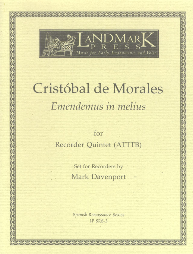 Morales: Emendemus in melius , set for recorders, viols or other early instruments (ATTTB) by Mark Davenport.Of all the sixteenth-century Spanish composers, Cristobal de Morales (ca. 1500-1553) was the most highly esteemed, not only during his lifetime but for hundreds of years after his death. Emendemus in melius is widely acclaimed among the splendors of sixteenth-century Spanish polyphony. The well-known musicologist Willi Apel, included the motet in his classic study, the Historical Anthology of Music, calling this "one of the greatest works in all music history!"