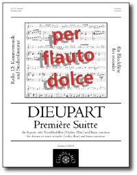 für Sopran- oder Tenorblockflöte (Violine, Flöte) und Bc., hg. Müller-Busch, Partitur und Stimmen.Die vorliegende erste Suite entstammt einem 1702 bei Estienne Roger in Amsterdam erschienenen Druck mit dem Titel Six / Suittes de Clavessin / … / Composées & Mises en Concert / Par / Monsieur Dieupart / Pour un Violon & flûte avec une Basse / de Viole & un Archilut / Dédiées à / Madame la Comtesse de Sandwich / … Ungewöhnlich und interessant ist hierbei, dass die Stücke tatsächlich beinahe gleichzeitig in einer Version für Cembalo solo (1701) sowie für ein Soloinstrument und Basso continuo (1702) erschienen. Obwohl im Wesentlichen gleich, sind doch Abweichungen zwischen beiden Fassungen zu vermerken. Neben kleineren harmonischen und melodischen Änderungen sind im Cembalopart eine Vielzahl von Verzierungszeichen vorhanden, die in der Violinstimme fast vollkommen fehlen. Hingegen ist die reichhaltige Bezifferung der Bassstimme in der Cembalostimme nicht enthalten.Über Dieuparts Leben sind bislang nur wenige Details bekannt und gesichert. Geburts- und Todesjahr liegen völlig im Dunkeln und selbst über seinen Vornamen herrscht Ungewissheit. Während er sich selbst 'Charles' nannte war sein Taufname wohl „François“. Nachweisbar ist Dieupart zwischen 1703 und 1724 in London, wo er als Geiger, Cembalist und Komponist an einer Vielzahl von Opernaufführungen und Konzerten beteiligt war. Er bewegte sich dort in Gesellschaft so illustrer Musiker wie Fr. Geminiani, G. Bononcini, W. Croft, Th. Clayton oder J. Chr. Pepusch.Beispielseite