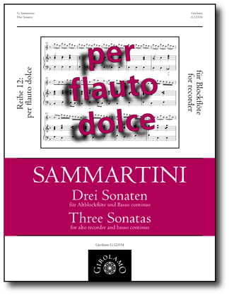 (Ms. Parma Nr. 4, 13, 16) für Altblockflöte und Bc., hg. Dalla Libera, Part. und Stimmen.Giuseppe Sammartini wurde 1695 in Mailand geboren. Seine musikalische Ausbildung erhielt er sehr wahrscheinlich von seinem Vater, dem aus Frankreich stammenden Oboisten Alexis Saint-Martin. Schon 1711 trat er in Novara als Oboist auf. Ab 1720 spielte er im Orchester des Teatro Regio Ducale in Mailand. Und so eilte ihm bereits ein sehr guter Ruf als Oboenvirtuose und Komponist voraus, als es ihn, in die Fußstapfen vieler italienischer Instrumentalisten und Komponisten seiner Zeit tretend, um 1728 nach London zog. Dort spielte er unter anderem als Solist im Orchester am King's Theatre unter der Leitung Georg Friedrich Händels. Später wurde Sammartini 'Musick Master' im Hause von Friedrich Ludwig, Prince of Wales. Diese Stellung behielt er bis zu seinem Tode im Jahr 1750 inne.Es ist anzunehmen, dass Sammartini – wie zuvor schon sein Vater sowie in Übereinstimmung mit der damaligen Instrumentalpraxis – alle Holzblasinstrumente beherrschte, also auch die Block- und die Traversflöte. Beiden Instrumenten widmete Sammartini zahlreiche Werke, die uns in Drucksammlungen oder als Handschriften überliefert sind.Die drei vorliegenden Sonaten entstammen dem Manuskript 'Sinfonie / di / Giuseppe S. Martino', welches in der Biblioteca Palatina in Parma (Signatur: Sanv. D. 1) aufbewahrt ist. Diese Handschrift gehört zu einer Sammlung von sieben Manuskripten aus der ersten Hälfte des 18. Jahrhunderts. Sie enthalten Originalkompositionen und Bearbeitungen für Blockflöte. Die Sammlung stellt das persönliche Repertoire von Paolo Antonio Parensi dar, eines aus Lucca stammenden adligen Flötenliebhabers.Das Sammartini-Manuskript enthält 17 Sonaten 'à Flauto solo e Basso'. Zwölf davon weisen keine Übereinstimmung mit anderen Werken des Komponisten auf, darunter auch unsere drei Sonaten. Wie die meisten Sonaten aus dem Manuskript, sind sie in der eher moderneren dreisätzigen Form – schnell-langsam-schnell – geschrieben. Die langsamen Sätze – in zwei Sonaten mit "Andante" überschrieben – zeichnen sich durch ihre singenden, ausdrucksstarken Melodien aus und sind in die Paralleltonarten eingebettet. Die schnellen Sätze weisen die wesentlichen Charakteristika von Sammartinis Stil auf und wecken immer wieder die Erinnerung an das berühmte Konzert in F-Dur für Sopranblockflöte. Beispielseite