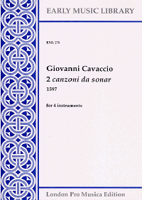 for 4 instruments.These two canzoni da sonar are taken from Ciovanni Cavaccio's Musica... ove si contengono 2 fantasie. .. canzoni alla francese pavana co'l saltarello, Venice, 1597, which, as the title suggests, is a rather varied collection of different kinds of instrumental music; the rather attractive pavana-and-saltarello pair based on the passamezzo antico has already been published in this series (EML 265).La Bignani makes use of a popular dance tune that probably originated in Germany: it appears in Susato's Danserye of 1551 ("Allemande VII”), Phalèse's 1571 dance book ("Almande Smedilijn"), Mainerio's II Primo Libro de Balli (1578) ("Tedescha" - printed in LPM TM66), and several other sources. It was used by several Italian composers c. 1600 as a theme for instrumental fantasias or canzoni: Gastoldi included an anonymous 2-part piece in his Il Primo Libro della Musica a due voci (1598) (see LPM IM8), and Ottavio Bariola produced a rather witty number based on it in his Capricci over canzoni a quattro, libro terzo of 1594 (to be published in our Italian Instrumental Music series). The other piece, La Morari, also appears to be quite close to the world of dance music, and is far from the conventional imitative canzon da sonar; it seems to require a brisk tempo to do justice to its somewhat manic qualities.In this edition the original note values have been retained, except for the triple-time section of La Morari, in which they have been halved. Editorial accidentals appear in the usual way, printed small above the stave, applying to the one note only; original accidentals are taken as applying to the whole bar.