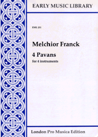 for 4 instruments.These four pavans come from Melchior Franck´s Newer Pavanen Galliarden unnd Intraden, auff allerley Instrumenten zu musicieren, mit vier fünff und sechs Stimmen gesetzt, Coburg, 1603. Unfortunately, as is the case with so many Franck collections, the only surviving copy of this print was lost in the 1939-45 war, so I have had to follow Franz Bölsche´s apparently reliable transcription in Denkmäler Deutscher Tonkunst, Erste Folge, XVI: Melchior Franck und Valentin Haussmann, Ausgewählte Instrumentalwerke, 1904, in which the original note values were retained.In these pieces Franck does not preserve a single solemn mood throughout, but instead presents a series of strongly-contrasting sections, as he does indeed in his wonderful six-part intradas (see LPM TM40 and TM54).The composer probably had stringed instruments mainly in mind as his first choice, but these rich and colourful works can also sound very fine on consorts of wind instruments such as cornetts, curtals and sackbuts, as well as recorders or flutes.