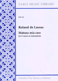 for 4 voices or instruments.Lassus´ Matona mia cara is printed here after Libro de villanelle, Moresche et altre canzoni a 4, 5, 6 & 8 voci Di Orlando di Lasso, published in Paris by Le Roy and Ballard in 1581; the piece itself was probably composed well before that date.This is a very broadly comic piece, in which a lanzo (German or Swiss mercenary soldier) crudely serenades his intended victim in broken Italian. As in many of the Florentine carnival songs of around 1500 featuring the lanzi, the singer has difficulty in pronouncing the letter “v”, which comes out as an “f”, so we have “follere” for “volere”; and the unfortunate slob seems to only know one form of all verbs, that of the infinitive.In this edition the original note values have been halved. One or two editorial accidentals have been added: they appear in the usual way above the stave. Obviously a purely vocal performance hinges on the delivery of the words. In a purely instrumental performance the [don don don] refrains need be much lighter than the verses.