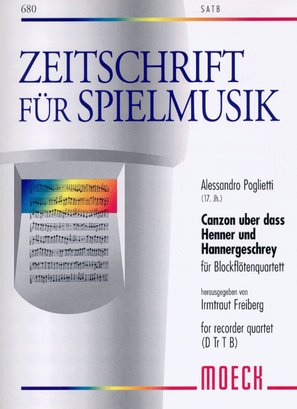 uber dass Henner und Hannergeschrey für Blockflötenquartett (SATB), Spielpartitur, hg. Freiberg.Schwierigkeitsgrad 3.