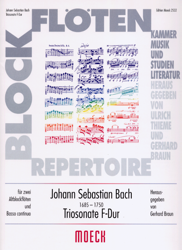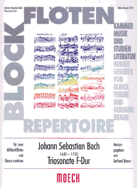 BWV 1028 für 2 Alt-Blockflöten und Bc., hg. Braun.Mit neuem Notenbild und praktikablen Wendestellen. Unter der Nr. 1028 ist in Wolfgang Schmieders Bach-Werke-Verzeichnis (BWV) eine Sonate in D-Dur für Viola da gamba und obligates Cembalo registriert. Die vorliegende Ausgabe stellt den Versuch der Rekonstruktion einer vermuteten ursprünglichen Triofassung dar und versucht zusätzlich mit der Transposition nach F-Dur das Werk für zwei Altblockflöten und B.c. ausführbar zu machen. Diese Ausgabe ist die Erweiterung des Blockflöten-Repertoires um ein musikalisch gewichtiges Werk von J. S. Bach. Schwierigkeitsgrad 4.