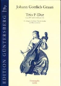 für Viola da gamba oder Viola und obligates Cembalo, GraunWV A:XV:10 (Wendt 119), hg. L. und G. von Zadow, Erstausgabe.Mit dieser Ausgabe wird eins der interessantesten Werke für Viola da Gamba und Cembalo, das einen Höhepunkt des spätbarocken Repertoires darstellt, zum ersten Mal im Druck veröffentlicht (siehe auch Trio C-Dur, G042). Hier hatte Graun offensichtlich die besonderen Eigenschaften von Gambe und Cembalo im Kopf, denn die Schreibweise ist für beide Instrumente sehr spezifisch. Idealerweise werden Cembalo und Gambe von einer Continuogruppe begleitet, die z.B. aus einem 2. Cembalo und einer 2. Gambe besteht. Das Trio kann aber auch von Cembalo und Gambe allein gespielt werden.
