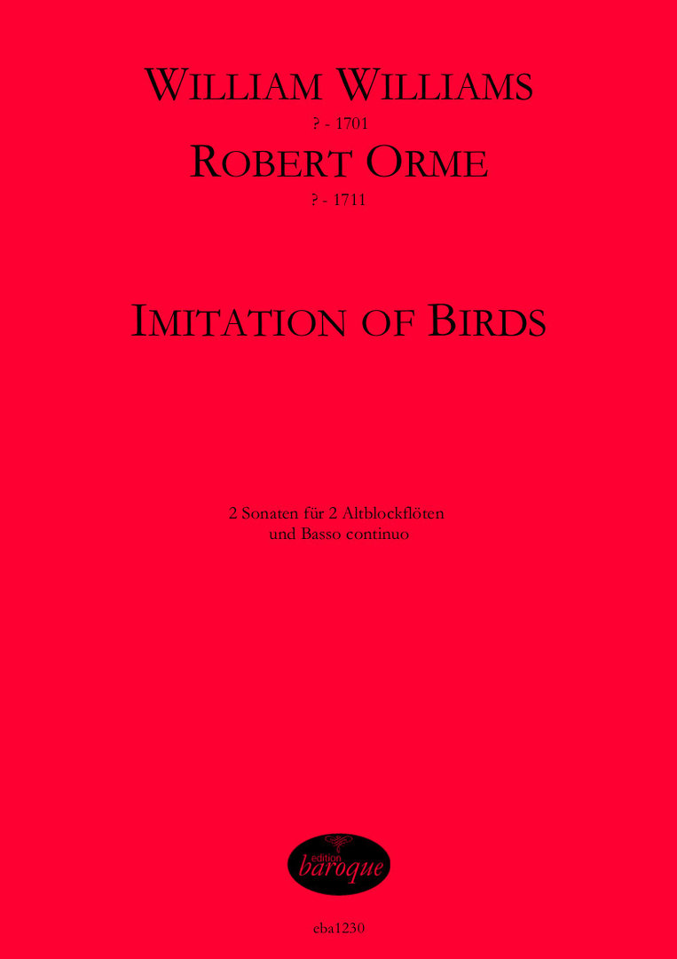 in Imitation of Birds & The Imitation of several Birds, zwei Triosonten in F-dur für 2 Altblockflöten und Bc.Für die Ornithologen unter den Blockflötisten: Neben der schon bekannten Sonate von Williams nun auch die zum ersten Mal veröffentlichte Sonate von Robert Orme.